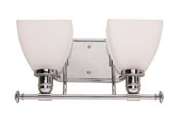 Shine 2 lite bathroom vanity features polished chrome finish adorned with white shapely glassware that provide even and pleasing diffused lighting (metal parts are sealed to protect against bathroom humidity).,Bulb Type: Medium Category: Bathroom Vanities Collection: Shine Extension: 7 Finish: Chrome Fixture Type: Vanity Height: 7 Listing: UL and or CSA Number of Lights: 2 Rated for: Interior Wattage: 100 Width: 14-1 2 Read more...
