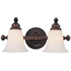 This distinct sconce adds elegance to a bathroom or vanity with frosted bell shades and a deep royal bronze finish. The shades may be positioned facing up or down. Takes two 100-watt medium base bulbs (not included). Approved for damp location use as defined by the National Electric Code. Please consult your local electrical code for details. Dolan Designs offers an unparalleled selection of lighting fixtures, from classic designs to the latest styles and finishes. Without sacrificing affordability, each piece is a statement of style and beauty. DL # 209597. Read more...