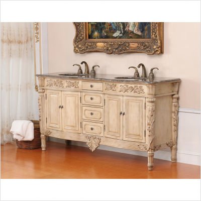 LD-1025T Vanity Top Finish: Travertine Faucets Not Included Features: -Double bathroom vanity. -Antique ivory finish. -Vanity top available in: -Baltic brown finish. -Travertine finish. . -Solid birch construction. -Three holes. -Comes with 18'' undermount ivory ceramic bowls. -Holes are pre-drilled for standard 8'' center faucets. -Has a very ornate design of floral and leaves. -Decorative resin patterns adorn the apron under the top and on the lower. -Horizontally ribbed apron add an elegant focal point for your Master Bath. -Carved details complete the look of old world charm and elegance. -Stunning four door storage with shelves and four drawers. -Big back cutout for easy plumbing installation. -Overall dimensions: 36'' H x 67'' W x 21.5'' D. Read more...